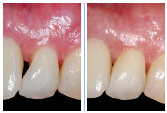 In den meisten Fällen von Zahnfleischrückgang liegt nur ein sehr dünnes und schwaches Zahnfleisch vor, sodass eine Verdickung des Gewebes erreicht werden muss. Dies kann durch Verwendung eines Ersatzmaterials „aus der Packung“ oder durch eigenes Gewebe aus dem Gaumen erreicht werden. Nach Einheilung und Verwachsung von altem und neuem Gewebe entsteht neues, festes Zahnfleisch mit keinem oder nur geringem Unterschied zu benachbarten Bereichen.